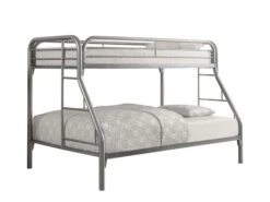 This bunk bed has youthful convenience and comfort. Top bunk has a slatted railing to ensure a safe, restful sleep. Each end features a ladder for easy up-and-down access. Metal frame is finished in lustrous silver for a contemporary ambiance. With a 20/20-piece slat kit included, this bed brings fun and luster to the bedroom.