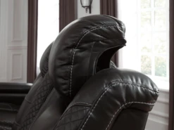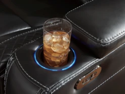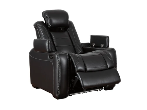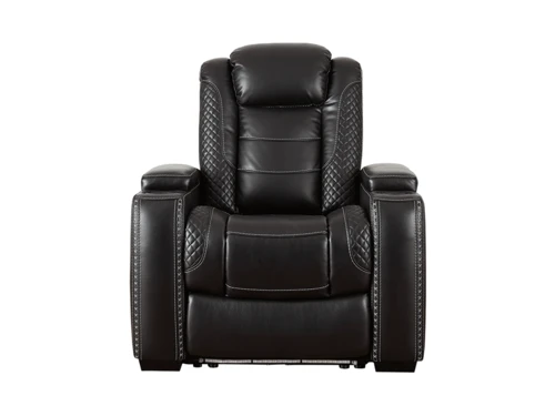 Need a fun, relaxing spot to unwind and watch TV? You’ll find that space with the Party Time power recliner with adjustable headrest. In a midnight-colored polyester upholstery with cross hash stitching, lattice accents, and LED lighting, it has a fabulously modern look. When it comes to comfort, you’ll love the reclining bucket seat and its adjustable power headrest that delivers a personalized comfortable angle for TV viewing. It’s convenient too—sporting lighted cup holders, built-in power button with USB port on control, flip up padded armrest with hidden storage underneath and lower LED lighting. It’s certain to become a hit in any home.