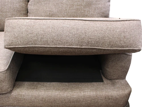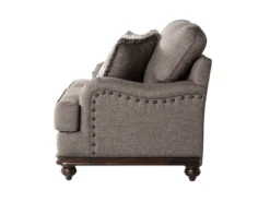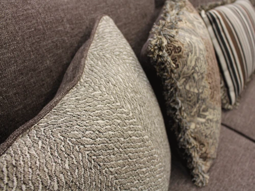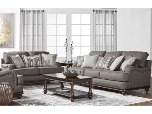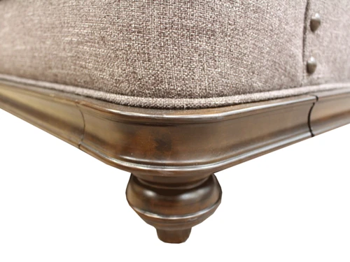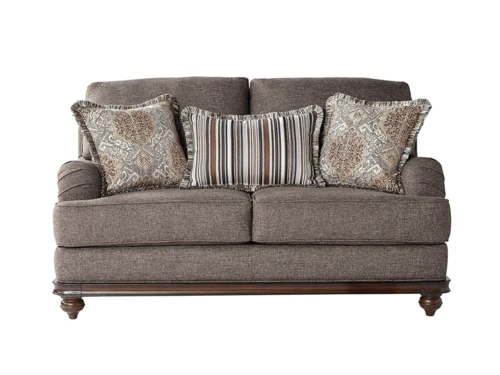 Traditional English Style with rustic nail head details, curved wood base, reversible seat cushions & an eclectic pillow pattern mix all included.