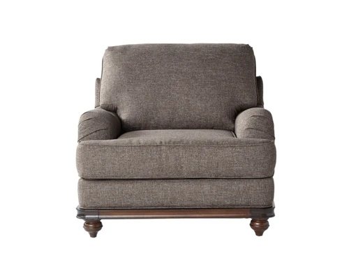 Phineas Driftwood Chair is a Traditional English Style with rustic nail head details, curved wood base, reversible seat cushions & an eclectic pillow pattern mix.