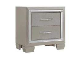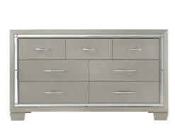 The glamorous Platinum storage bed is dressed in a fashionable champagne finish and adorned with a chic mirror trim. The upholstered headboard as well as the mirror feature mood lighting for a soft glow at the end of the day. Two convenient storage drawers are included in the footboard to help keep you stylishly organized. Embossed drawer fronts and crystal accents in the drawer pulls complete the look.