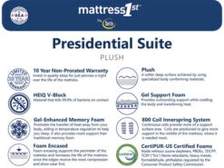 The Presidential Suite Plush is a two-sided mattress that provides both comfort and durability. Due to its two-sided design, the Presidential Suite is able to be flipped rather then just rotated. Both sides of the Presidential Suite Plush are comprised of durable support foam, and gel foam.