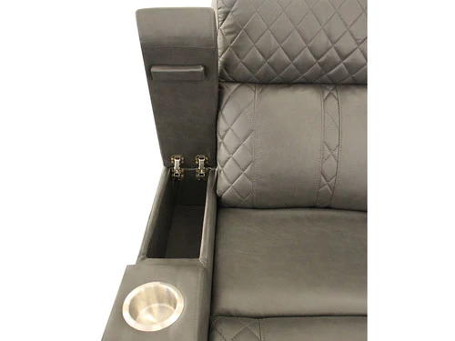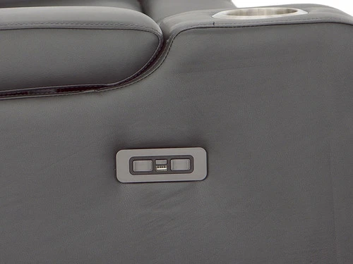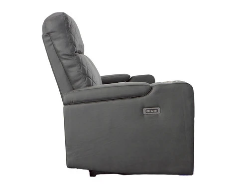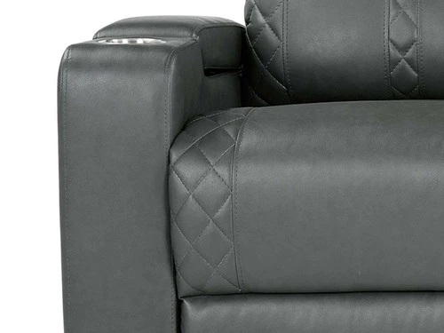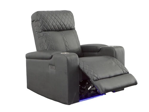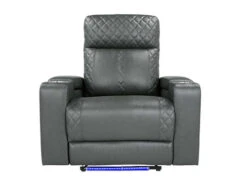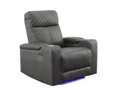 This Recliner will be your favorite place to relax and enjoy. In a gray Leatherette upholstered with cross hash stitching, and LED lighting, it has a fabulously modern look. You’ll love the reclining seat and its power. It’s also convenient: cup holders, built-in power button with a USB port on the controller, flip-up padded armrest with hidden storage. It is sure to become a hit in any home.
