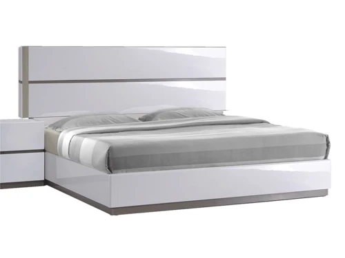 A sleek, modern platform bed, featuring an all-wood frame in a moisture-resistant high gloss 2-tone white and gray finish. Matching dresser, mirror, nightstand and chest available.