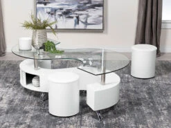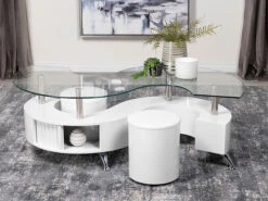 The coffee table features a smooth and glossy white finish, exuding a clean and modern aesthetic. The S-shaped design adds visual interest and creates an intriguing focal point. The curved lines of the table add a sense of fluidity and movement, making it a captivating piece of furniture. Included with the coffee table are two small stools that perfectly complement its design. These stools are designed to fit snugly within the S-shaped table when not in use.