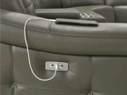 The Sammit Power Recliner Sectional is a contemporary combination functional sofa designed with the feature of fluency and dynamic sense which can be converted to different specifications according to space requirements. This Sofa brings a reclining seat and top grain leather match. The armrest has a classic designed with streamlined type and comfort, impressing people with a sense of relaxation and luxury. Every part of this sofa attracts people to relax when you lie down and enjoy all its functions. Top Grain Leather Match, USB ports, cup holders, storage console.