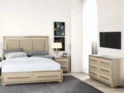 The beautiful Soho bedroom set has a modern style finished in Champagne and adorned with a special Nailhead trim around Headboard. Upholstered headboards feature mood lighting for a soft glow at the end of the day. Two convenient footboard storage drawers are included to help you stay stylishly organized. The accents on the drawer pulls and on bed they complete the special style of this bedroom set.