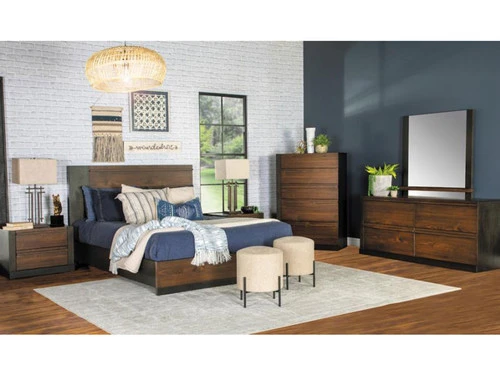 Compose a modern ensemble that works in easy-living bedrooms with a four-piece bedroom set designed to impress. Simplicity works wonders in a set with a class and style, as well as functionality to add convenience. Walnut and black two-tone finish Asian hardwoods and wood products join to offer richness and warmth. Case pieces feature felt-lined top drawers, easy drawer operation, and pulls built into fretwork to double down on a clean look with clean lines, as well as convenience USB ports in its nightstand. The set includes one platform bed with a spacious headboard, one nightstand, one dresser, and one rectangular framed mirror.