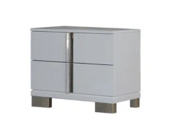 Venezia bedroom set upholstered bed is another creative modern design combination. Modern black or white platform like, upholstered bed stands on round detailed steel legs with squared stitched headboard. White solid wood elegant finish case goods accented by silver steel accents