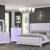 Venezia bedroom set upholstered bed is another creative modern design combination. Modern black or white platform like, upholstered bed stands on round detailed steel legs with squared stitched headboard. White solid wood elegant finish case goods accented by silver steel accents