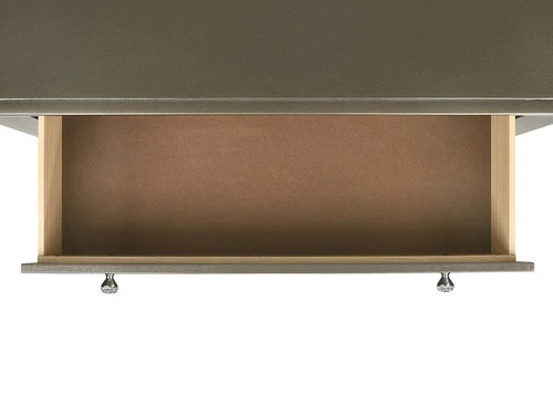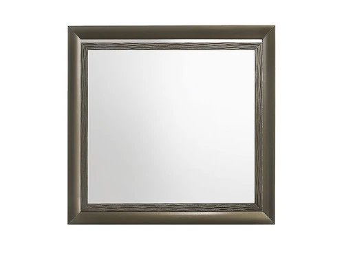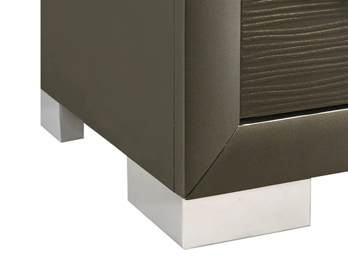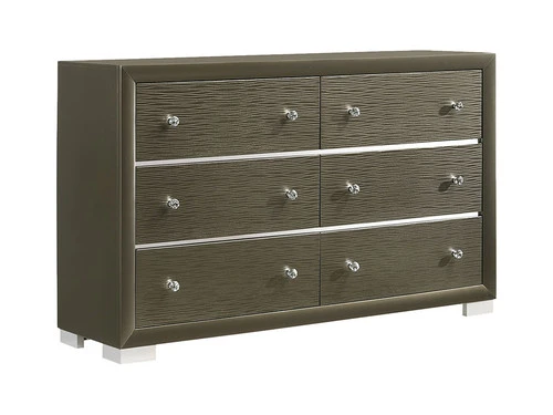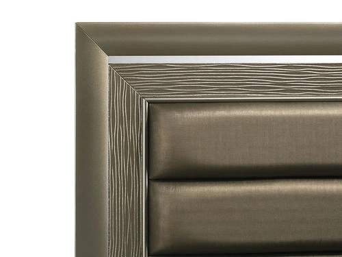 The sophisticated bedroom collection features a dark champagne finish paired with chrome hardware and feet. The paneled tufting detailing and mirror trim set this group apart. The headboard and mirror are equipped with a chic mirror trim feature. A faux leather upholstered headboard completes the look of this stylish set. The mirror trim detailing adds to the shabby chic look of this bedroom selection. The crystal like knobs on the case pieces give this collection an effortlessly elegant look.