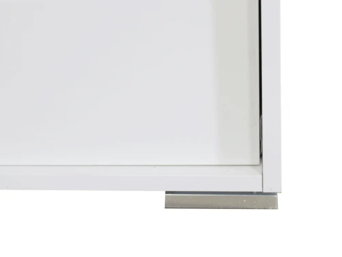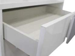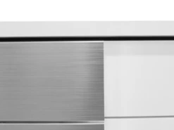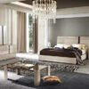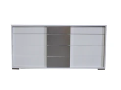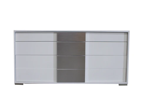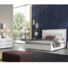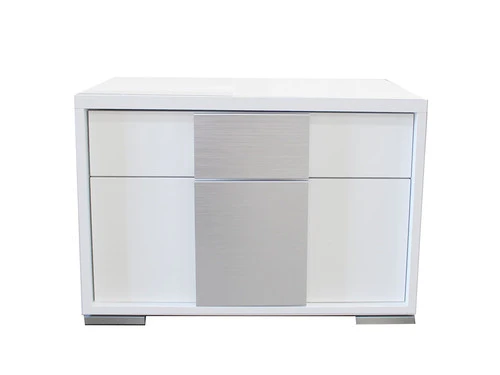 A distinguished, contemporary look is exuded by the Viola bedroom set, generated by its all-white high-gloss gray lacquer frontage which is accented by sophisticated brushed steel handles. This raw steel finish is featured on the headboard as well, enhanced by surrounding LED lighting which illuminates the luster of the expertly handcrafted bed and complimentary case goods. The brushed steel accompanied by a contrasting glossy white Italian lacquer gives this room a sleek, glamorous ambiance which is made distinguishable by the set’s unique design.