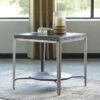 Elegant and striking, this round end table is ideal for a modern style home. Offering a touch of glam, this furniture piece is designed to offer a space next to a chair or sofa where you can keep a cocktail close at hand. Topped with a round cultured marble top, complete with grey striations, it offers a cheerful bright look. The open and airy metal base is finished in an electroplated chrome that offers a lustrous, gleaming shine. Wrapped around the upper base, just below the tabletop, is a matching band, which is also supported by chrome tapered legs.Enhance your decor with a touch of modern glam Round faux carrara marble top Metal base with stylish tapered legs finished in electroplated chrome Constructed with synthesized stone, and metal Finish: Faux Carrara Marble and Chrome