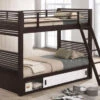 Add a hint of rustic charm with this beautiful twin over full bunk bed. Constructed of solid pine, the exposed wood grain features a warm gun smoke finish. The high and angled front legs offer an optional trundle option and Bunkie mattress. Full of smooth lines, the open silhouette looks great in a variety of spaces.