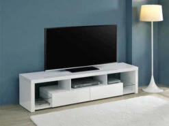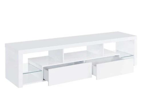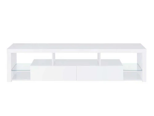 Elevate your entertainment realm with our sleek, modern TV stand. With a pristine glossy white finish and clear glass accents, it exudes elegance. Beyond looks, it’s the epitome of functionality. Soft-close drawers glide effortlessly, housing your gadgets, while the glass shelves offer a stylish display. Spacious storage compartments keep your media essentials neatly organized. This stand, a harmonious blend of style and function, becomes an indispensable centerpiece for any contemporary entertainment space.